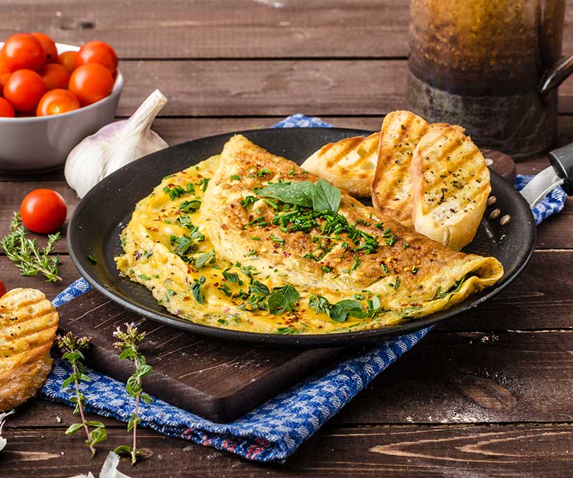 Breakfast Herb Omelette with Chives and Oregano sprinkled with Chili Flakes Phasellus facilisis turpis dictum tellus tincidunt elementum. Nullam maximus facilisis accumsan. Praesent bibendum quis ipsum sit amet hendrerit.EasyServes 115 mins